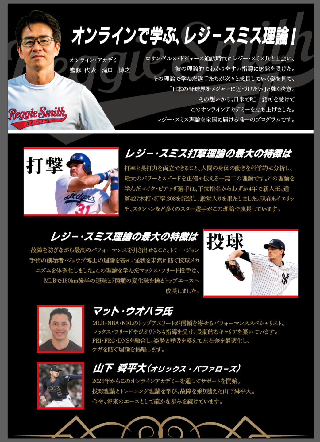 ロサンゼルス・ドジャースの通訳時代にレジー・スミス氏と交流し、彼の野球指導方法に感銘を受けた。そのシンプルで理論的に納得できるアプローチに驚き、その後、その理論に基づいた指導を受けた選手が飛躍的に技術向上し、プロ野球選手として成功する姿を目の当たりにした。この経験から、「野球指導は選手の野球人生を変える力がある」と確信。このオンラインコースは、レジー・スミス理論を日本全国に効果的に伝える唯一無二の手段であり、あなたの野球人生を変える可能性を秘めた動画となっています。